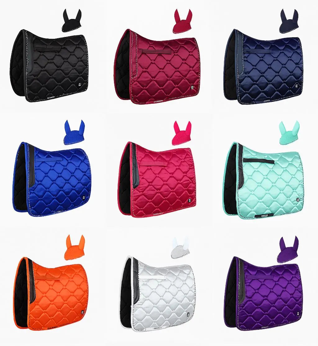 Crafted for riders who value precision and presentation, this dressage saddle pad and ear bonnet set by GallopGrip blends artisanal technique with functional design. The saddle pad features a quilted diamond surface with a subtle sheen, offering breathable comfort and optimal cushioning during flatwork and dressage training. Its contoured silhouette ensures a secure fit beneath the saddle, while the reinforced girth strap provides stability throughout movement.